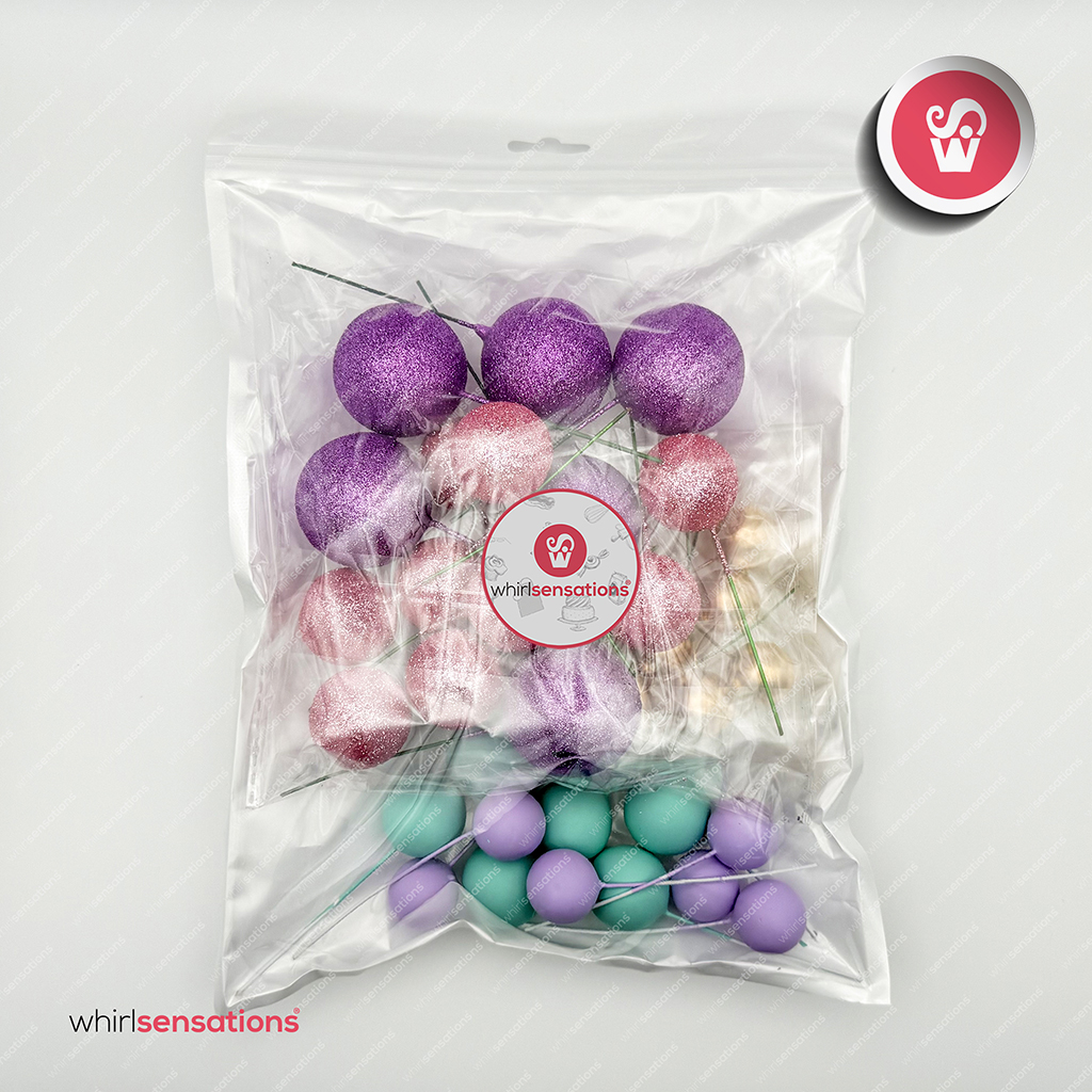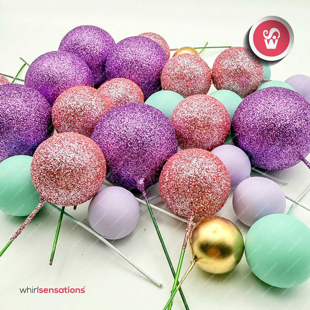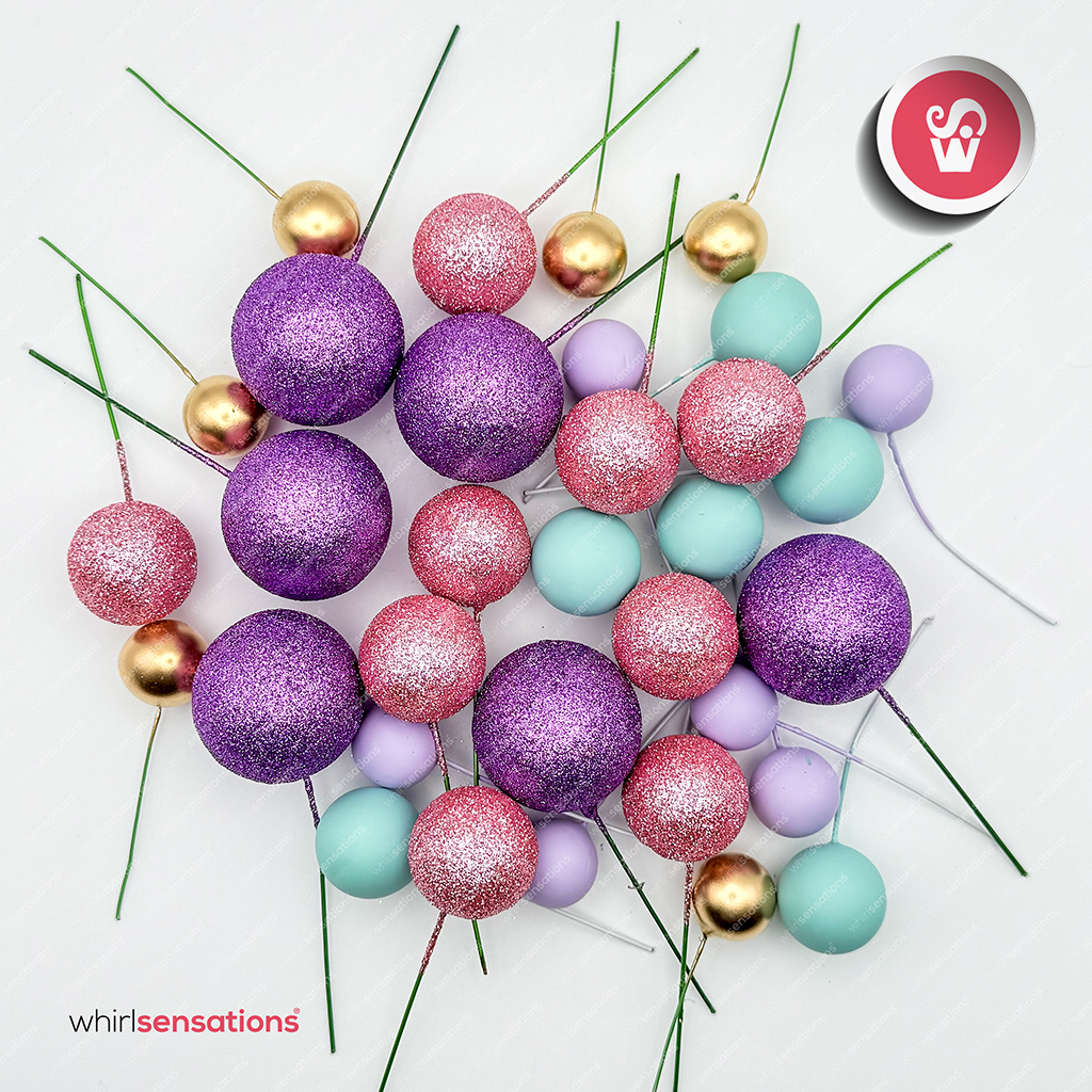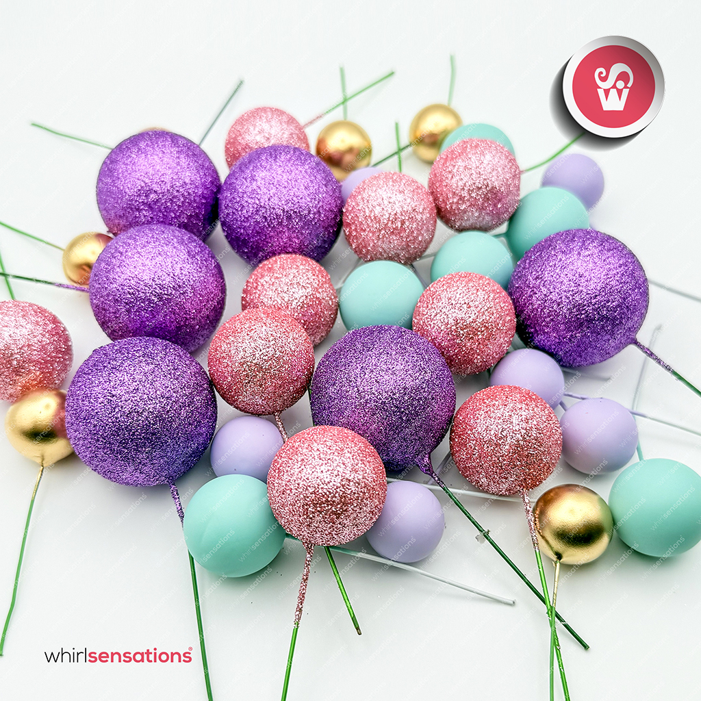 Bolinhas de esferovites pintadas em tamanhos variados , para decorar bolos , doces e sobremesas.