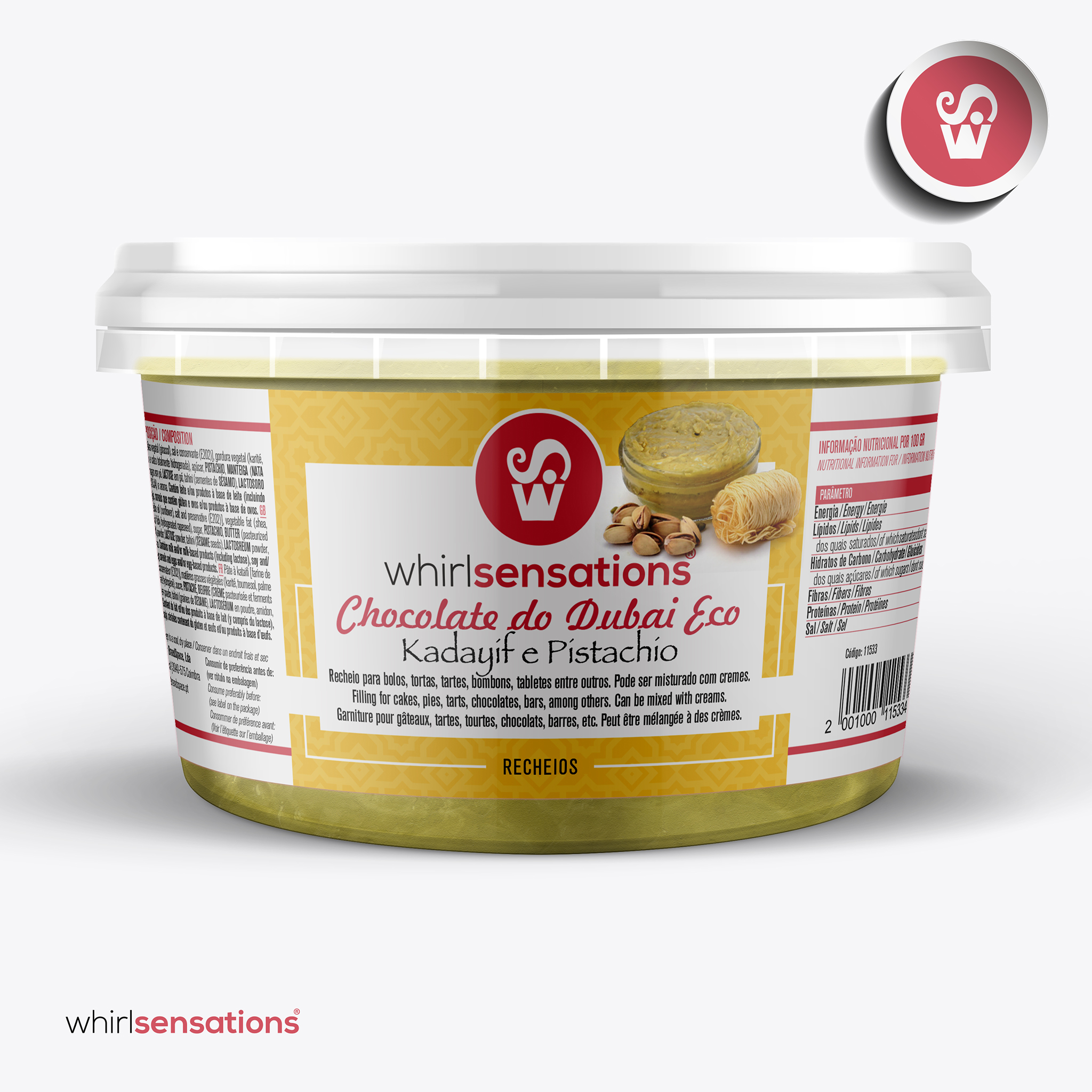 Uma fusão exótica e irresistível! Este recheio combina a cremosidade do chocolate branco com a textura crocante do kadayif e o toque sofisticado dos pistáchios.